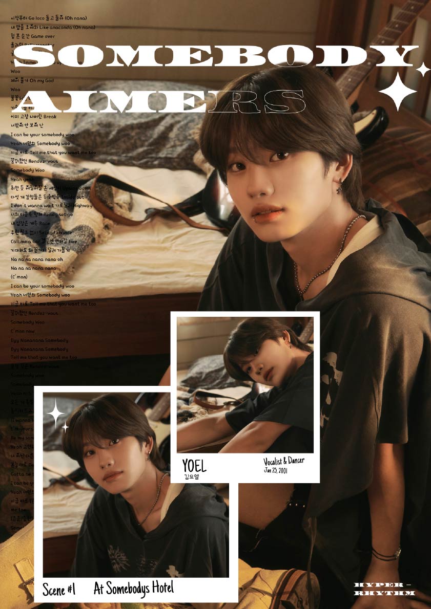 This (Lyrics) Poster was Inspired by AIMERS Single "Somebody". I used official Promotion Photos from the Member Yoel, because I liked the lighting and warm earth tones of the Photos.