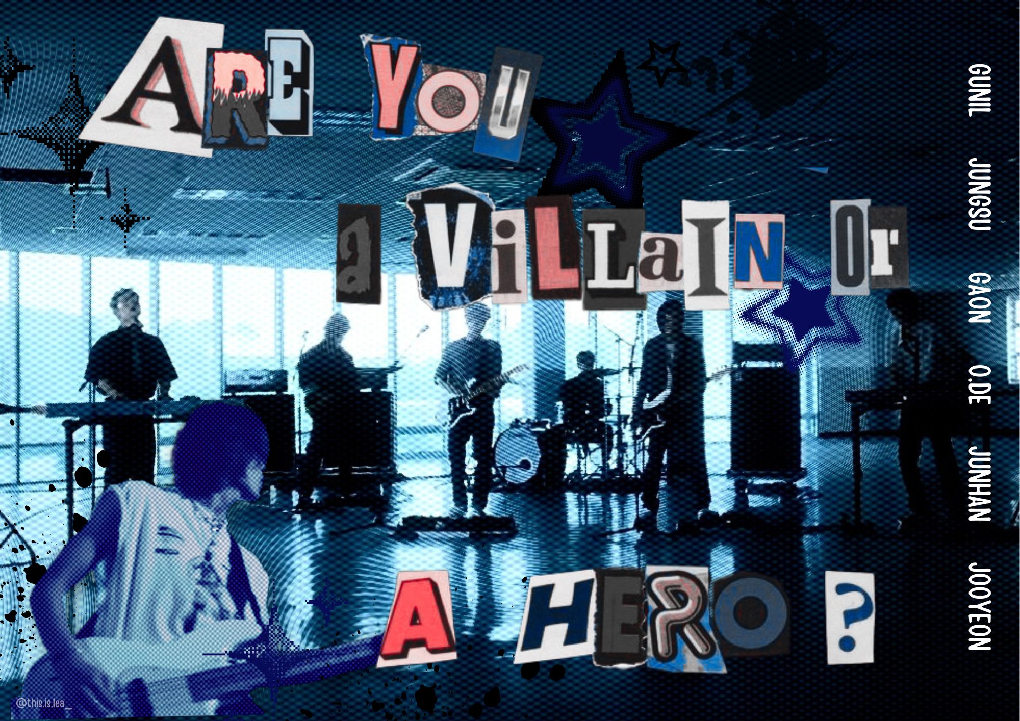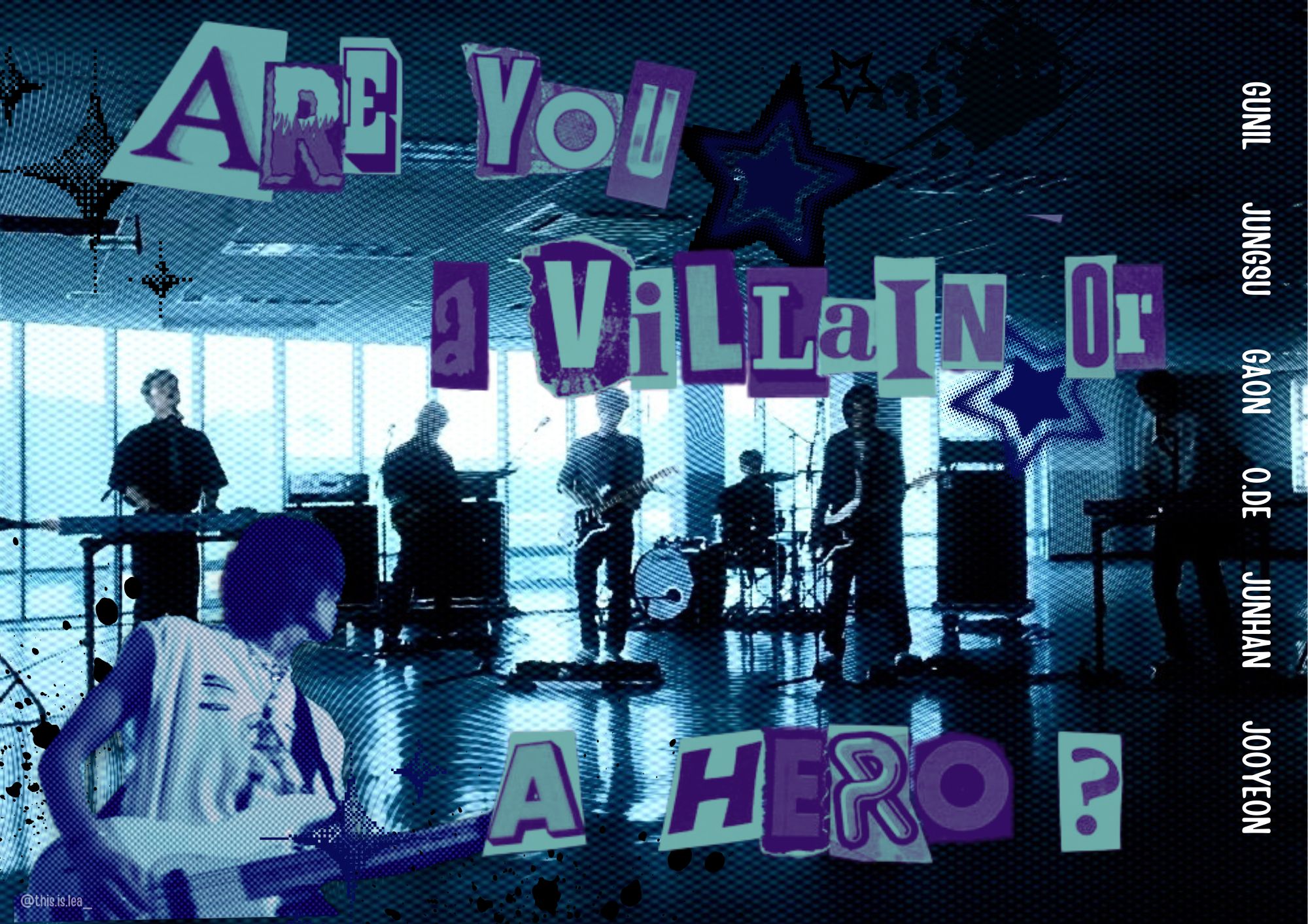 In the Background is a photo the Rock Band "Xdinary Heroes", their names are placed on the side and the Quote in the Middle was from an Interview of the Drummer, regarding the Groups Lore. I made two Versions since I couldn't decide if the letters should blend in with the background or not.