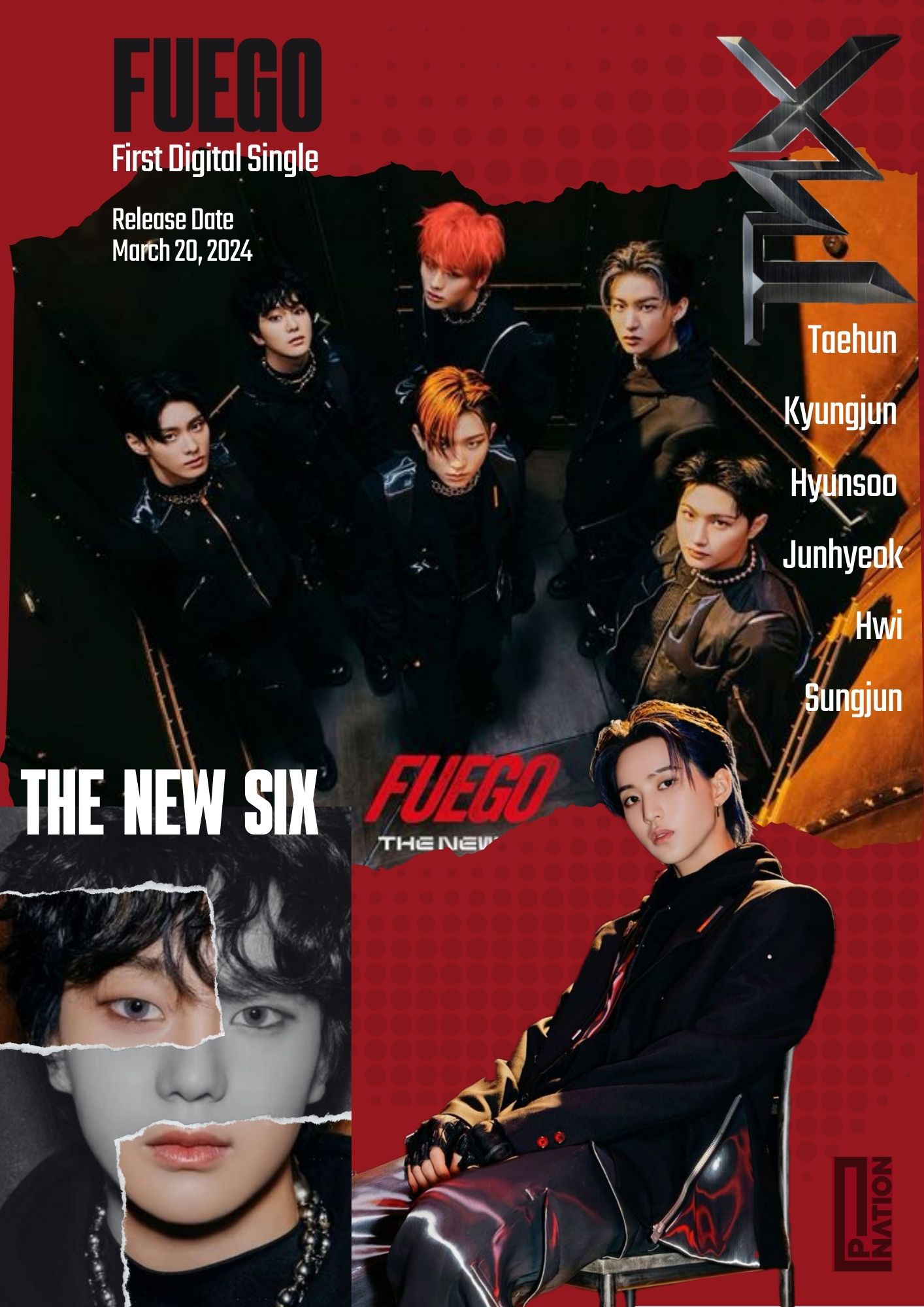 FUEGO was TNX'S 1st Digital Single, that came out mid 2024, the concept photos were dark and looked rebellious. That's exactly the vibe I wanted to create with the Poster, using the official photos and making them looked ripped. Since Fuego means fire, I thought a red background would match.